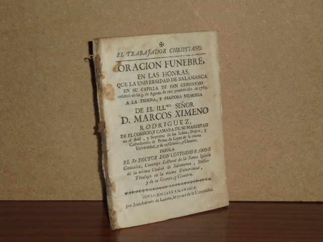 ORACIÓN FUNEBRE, EN LAS HONRAS, QUE LA UNIVERSIDAD DE SALAMANCA EN SU CAPILLA DE SAN GERONYMO CELEBRÓ EL DIA 3 DE AGOSTO DE ESTE PRESENTE AÑO DE 1782 A LA TIERNA, Y PIADOSA MEMORIA DE EL ILLmo. SEÑOR D. MARCOS XIMENO RODRIGUEZ, DIXOLA el Sr. Doctor Don Custodio Ramos Gonzalez.